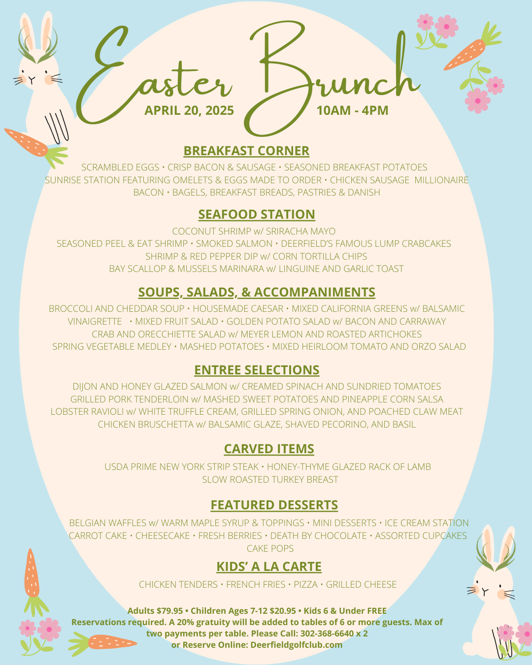 Hop into Spring with Us! Join us for a delightful Easter Brunch at Deerfield Golf Club on Sunday, April 20! Celebrate the joy of the season with a mouthwatering spread of delectable dishes, carefully crafted by our talented chefs. From classic brunch favorites to delightful Easter-themed specialties, there’s something to please every palate.