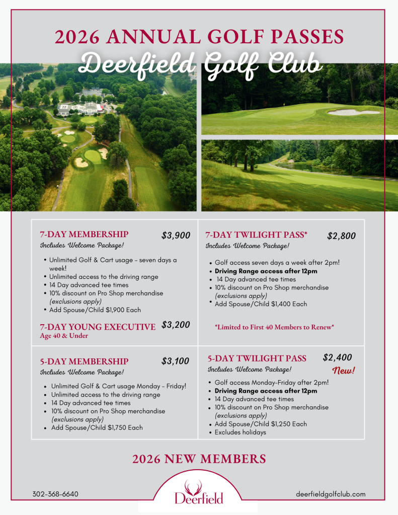 A Program For Everyone! – Sign up for the Deerfield Player’s Card and receive discounted greens fees every time you play! For only $69 per month, you can play anytime on Monday – Friday for just $30, and on Weekends & Holidays for $40 after 12PM.