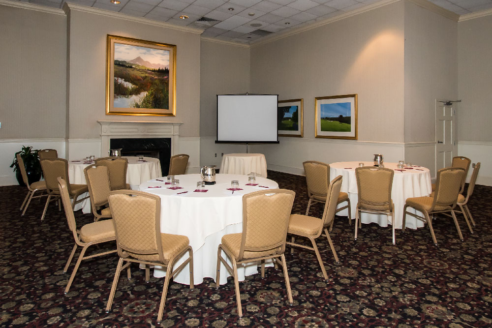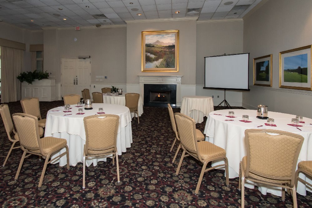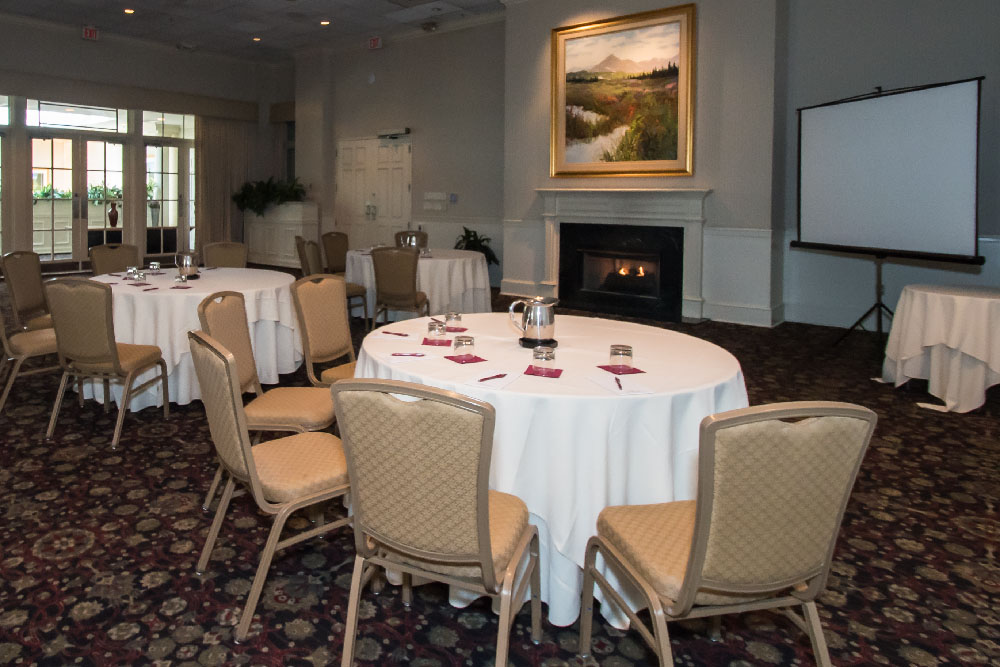 A refined, elegant venue for a business meeting, this space can also easily be transformed for your rehearsal dinner or luncheon – up to eighty guests. A stately marble fireplace is the centerpiece of this room with fine art adorning each wall making this the perfect space for a winter wedding ceremony.